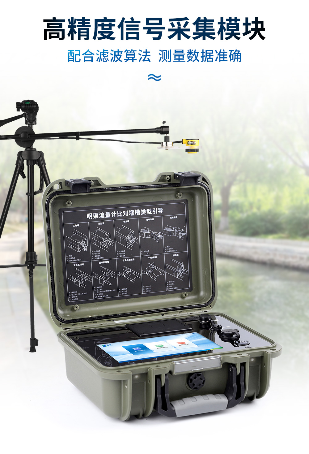 超声波明渠流量计是专为水文监测、江河流量监测、农业灌溉及市政给排水等行业设计的一种高精度测量仪表,支持10种堰槽类型的测量,采用超声波技术和特殊的微功耗设计方案,结合全数字信号处理技术,确保了测量的稳定性与可靠性。该设备具有广泛的测量范围和较高的测量精度,支持实时数据显示、数据记录、导出及打印等功能,操作简便且准确度高,非常适合于需要频繁移动进行测量的场合。